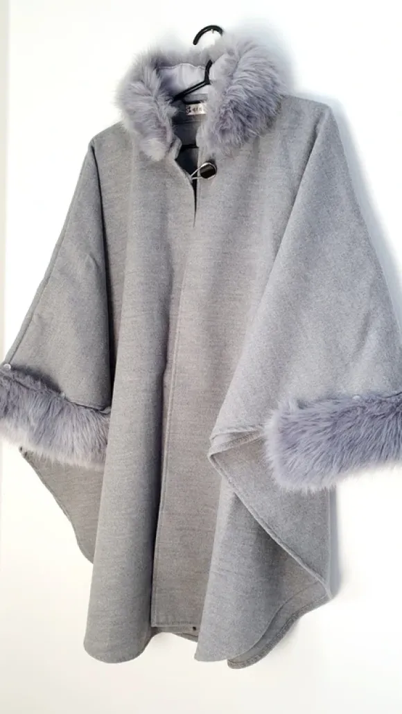 poncho with a faux fur trim on the hood and cuffs.